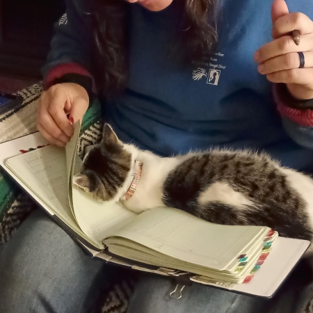 Meet Simon! 2022 rescue – dropped off on side of road. Simon is a punk rocker and likes to talk about it. He often rides around on Kris’ shoulders.